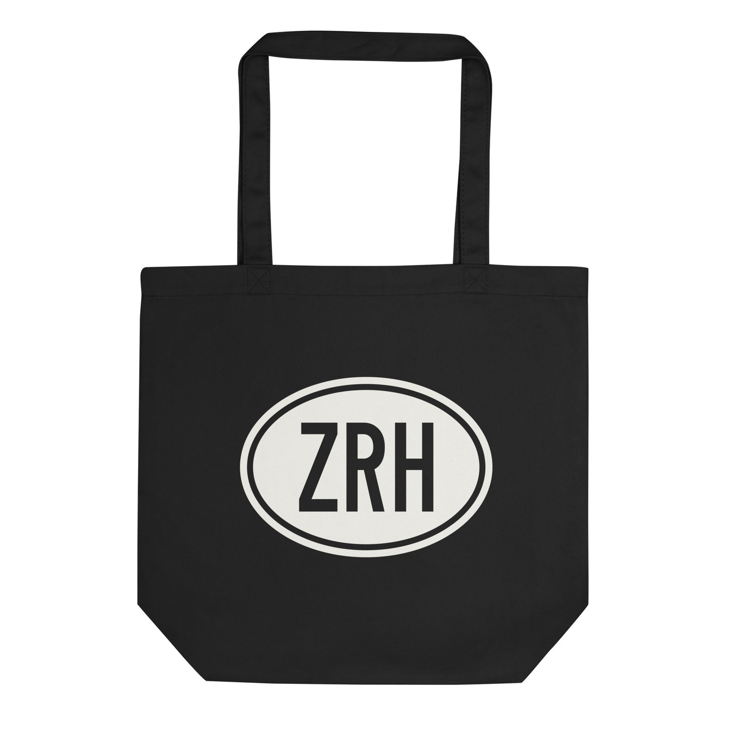 Elevate your daily routine with our organic cotton tote bag featuring Zurich, Switzerland's ZRH airport code — in a stylish nod to the classic oval car sticker once used to indicate a vehicle's country of registration. This design has evolved into an easily-recognizable cultural symbol of travel. It is elegantly printed in white on this black bag which serves as a bold backdrop.